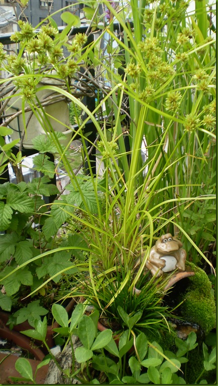 Como se puede ver en la imagen, la que yo tengo crece en una pequeña maceta junto a la tinaja por la que sale el agua una vez filtrada para caer de nuevo al estanque y en esas condiciones está bastante lozana y con muchas inflorescencias formadas por brácteas dispuestas en panículos, entre las brácteas se desarrollan las verdaderas flores muy pequeñas que pasan desapercibidas, algo similar a lo que sucede con las flores de las gramíneas.